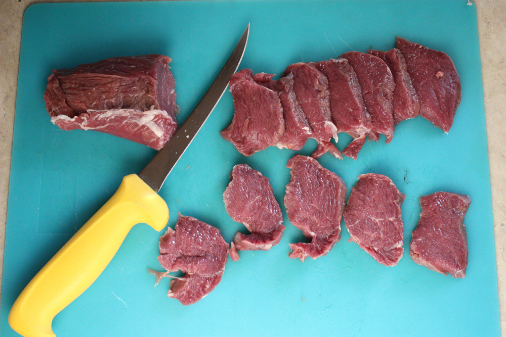 2. Slice loin into medallions (about 1/4″ thick)
