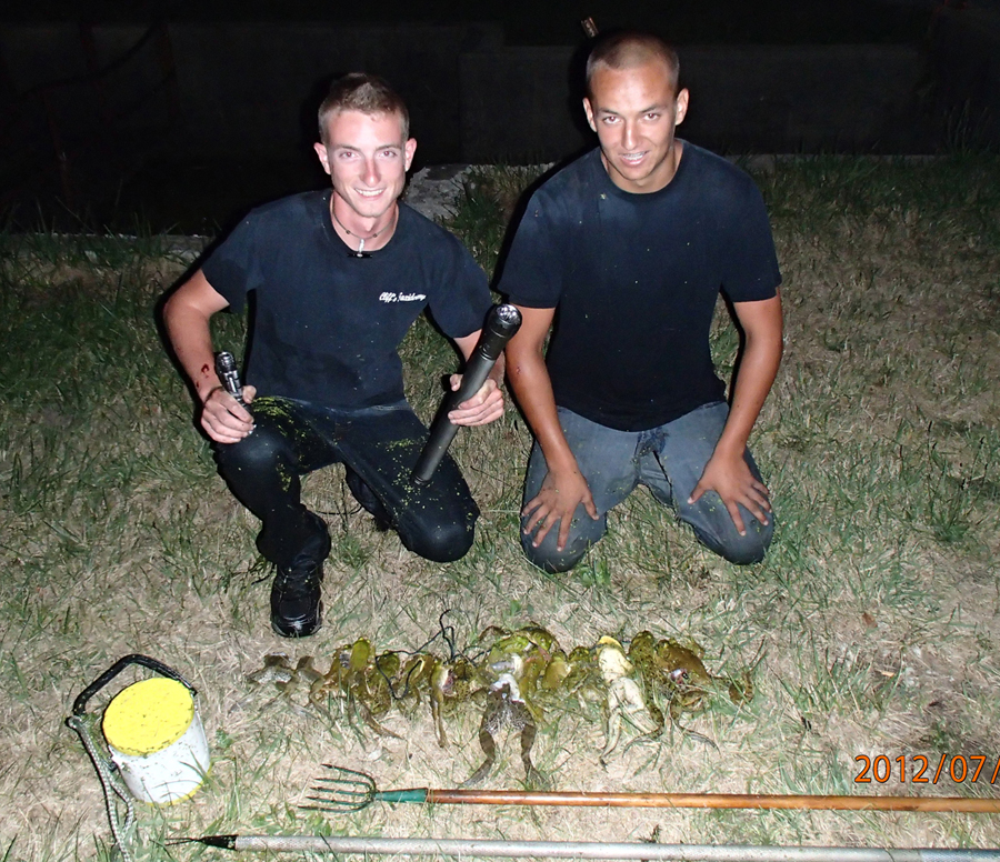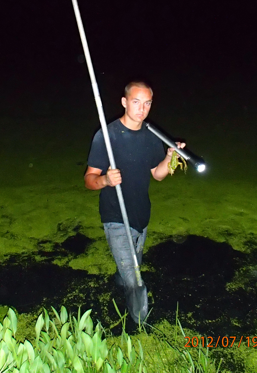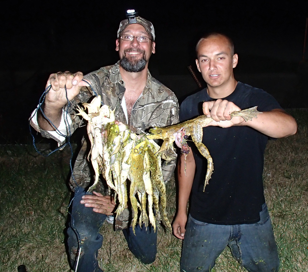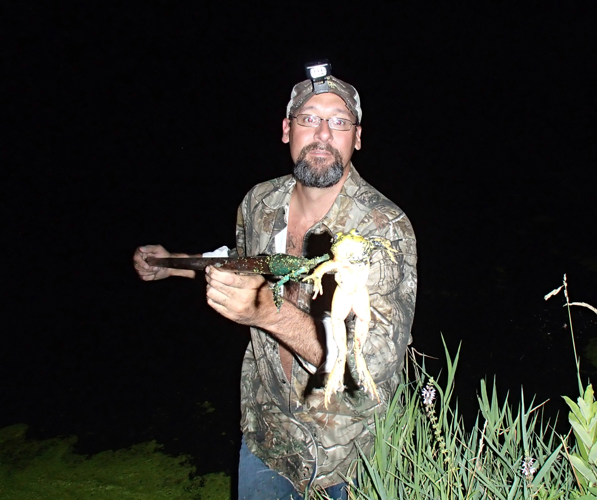 As the sun settled down behind the horizon, not far from the DesPlaines River, we heard our first “Barooomp, baroomp” echoing across the lilypad laden backwaters.  Before jumping out of the truck I ran through my checklist— bug spray, cooler, knife, flashlight, and gig. Gig? Yep, a long wooden pole with barbed spear forming a trident-like tool known as a frog gig. We weren’t out for night fishing, but bullfrog hunting.