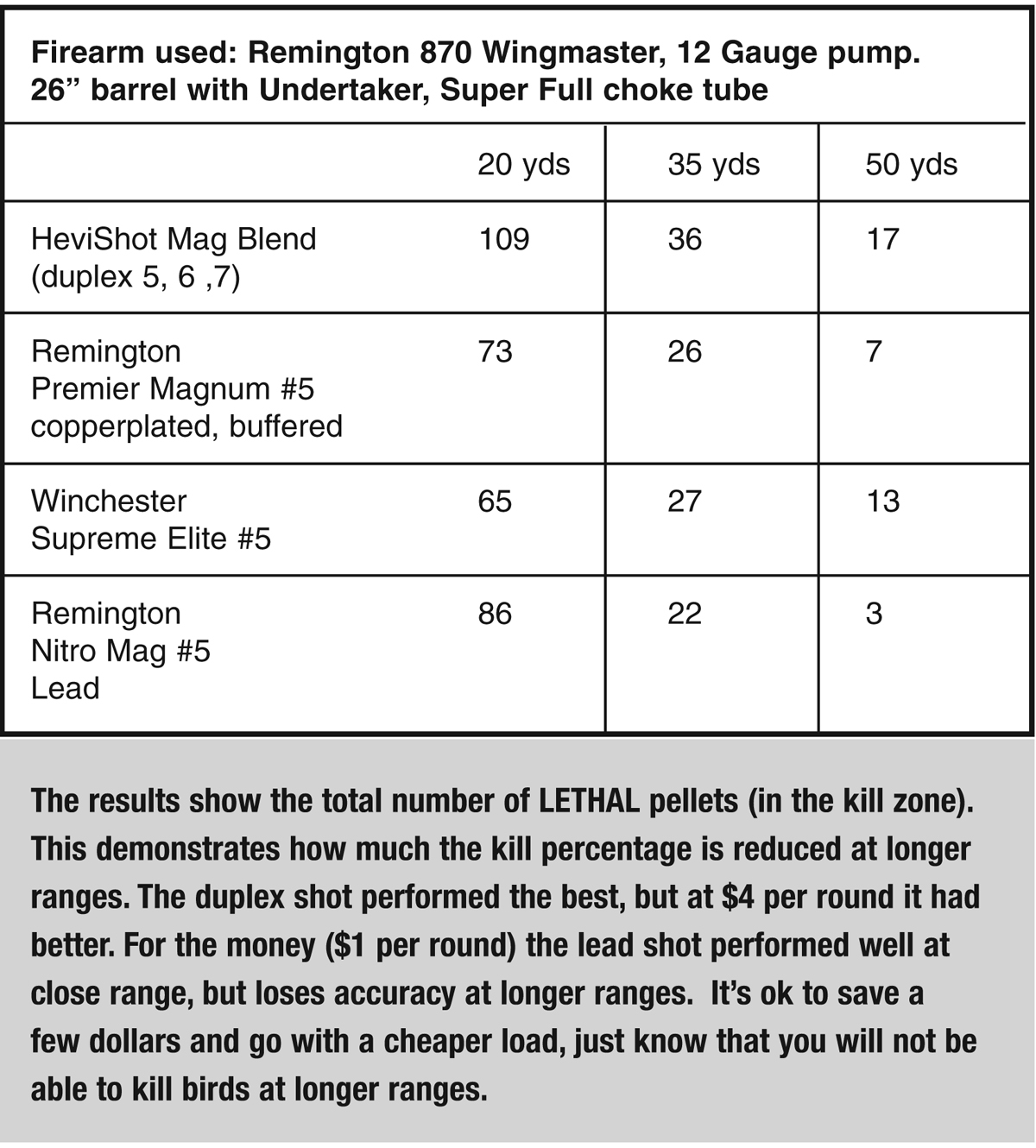 Understand that the best approach is always to fire different rounds through your own gun to find out what load patterns the best. These tests that were performed are to serve as a guideline to help you figure out the best load to use by taking some of the guesswork out of it. By knowing what load you shoot best, you will have the confidence in your weapon as well as knowing your lethal killing range. And that can make the difference between going home with a bird or stopping at the supermarket for a Butterball.