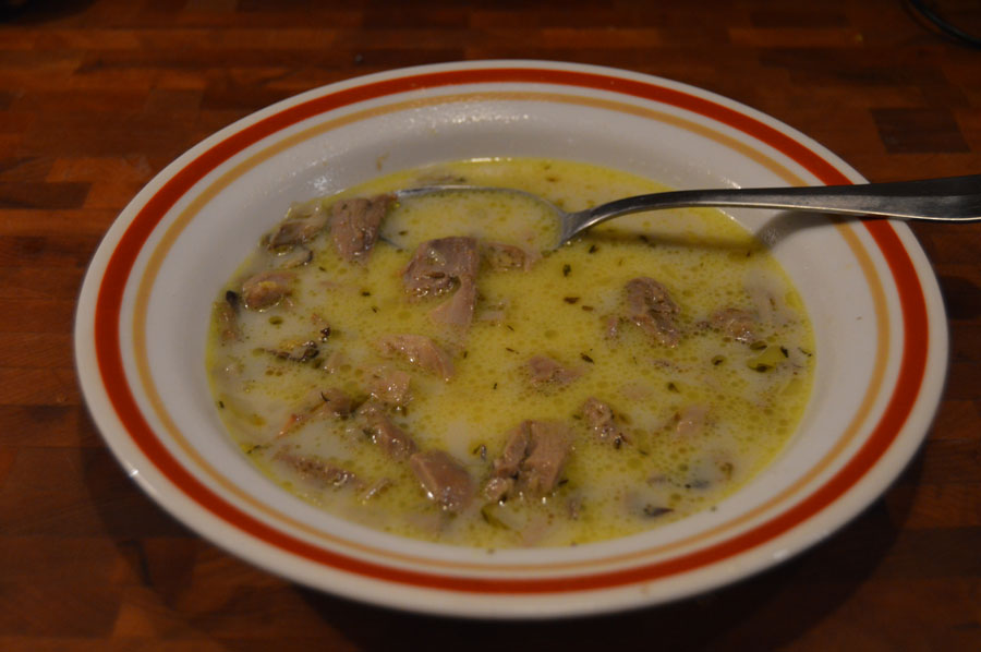 – then remove from stock and pull the pheasant meat off the bone (stay away from tendons) and cut into small pieces
